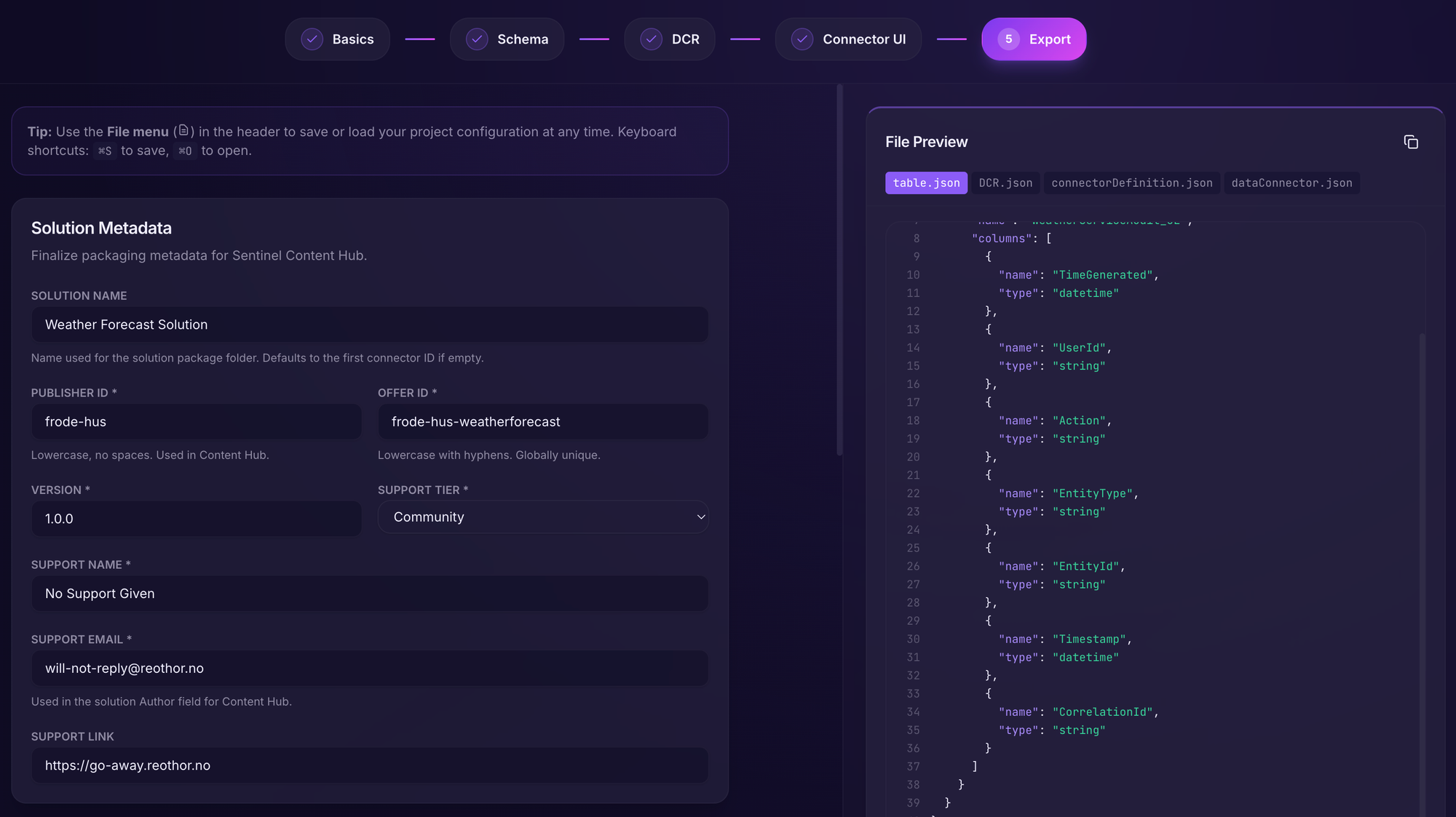 File /Users/frode.hus/src/github.com/frodehus/Azure-Sentinel/Solutions/Weather Forecast Solution/Package/testParameters.json is a valid Json file!Technically, if you are the developer - you are now done! Distribute this template to your SOC or at least make it available somehow.