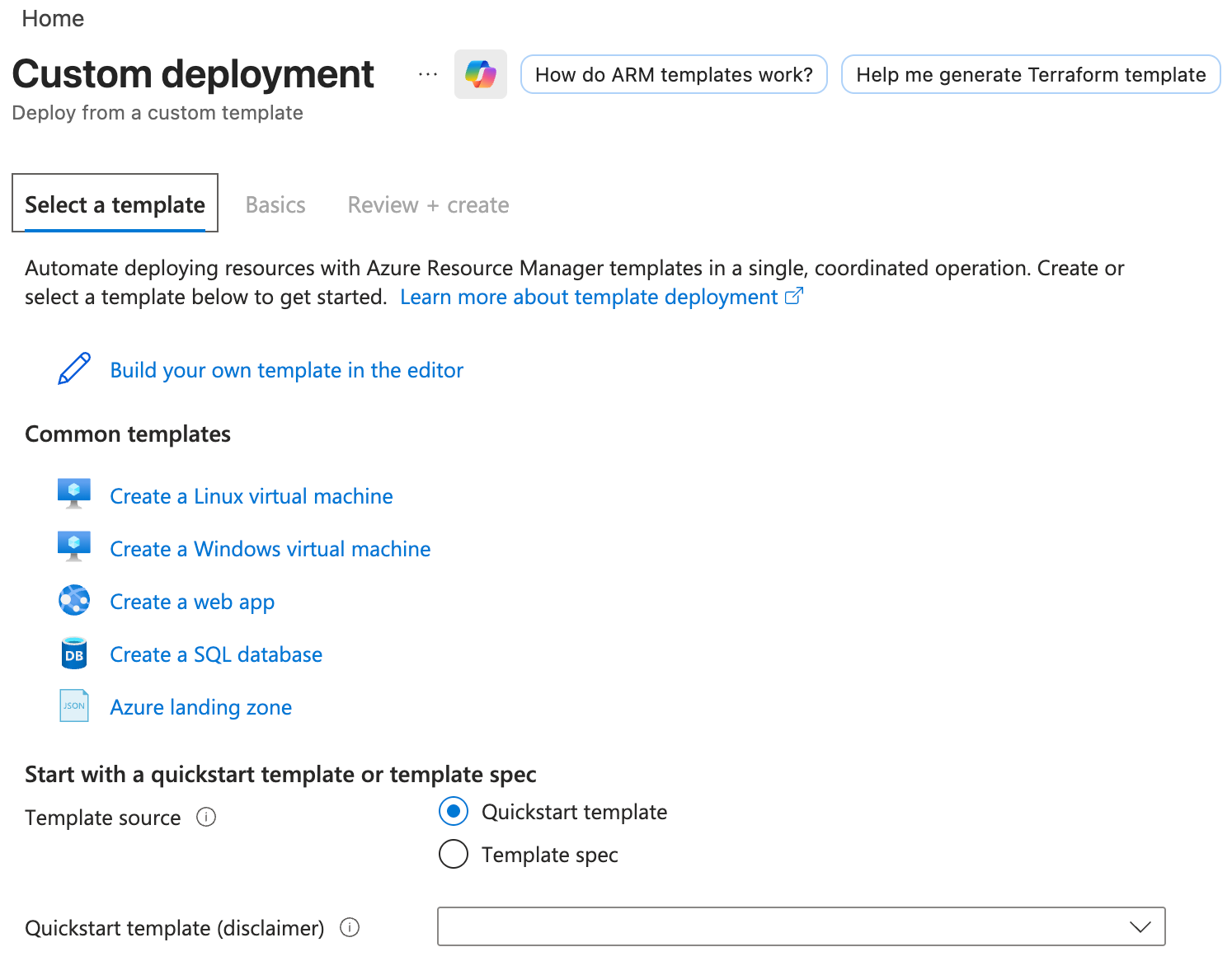 We'll go to Deploy custom template and click on "Build your own template in the editor":