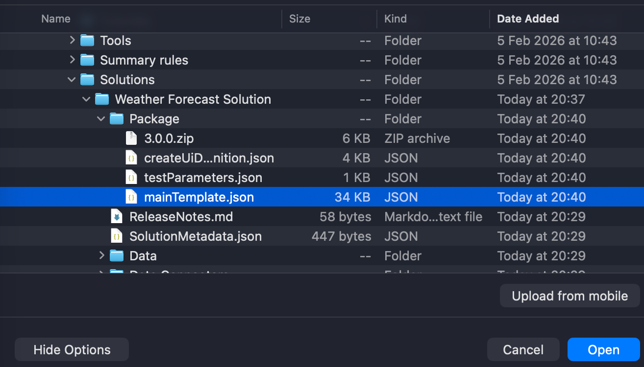 Navigate to our solution folder and select the mainTemplate.json file and upload it.