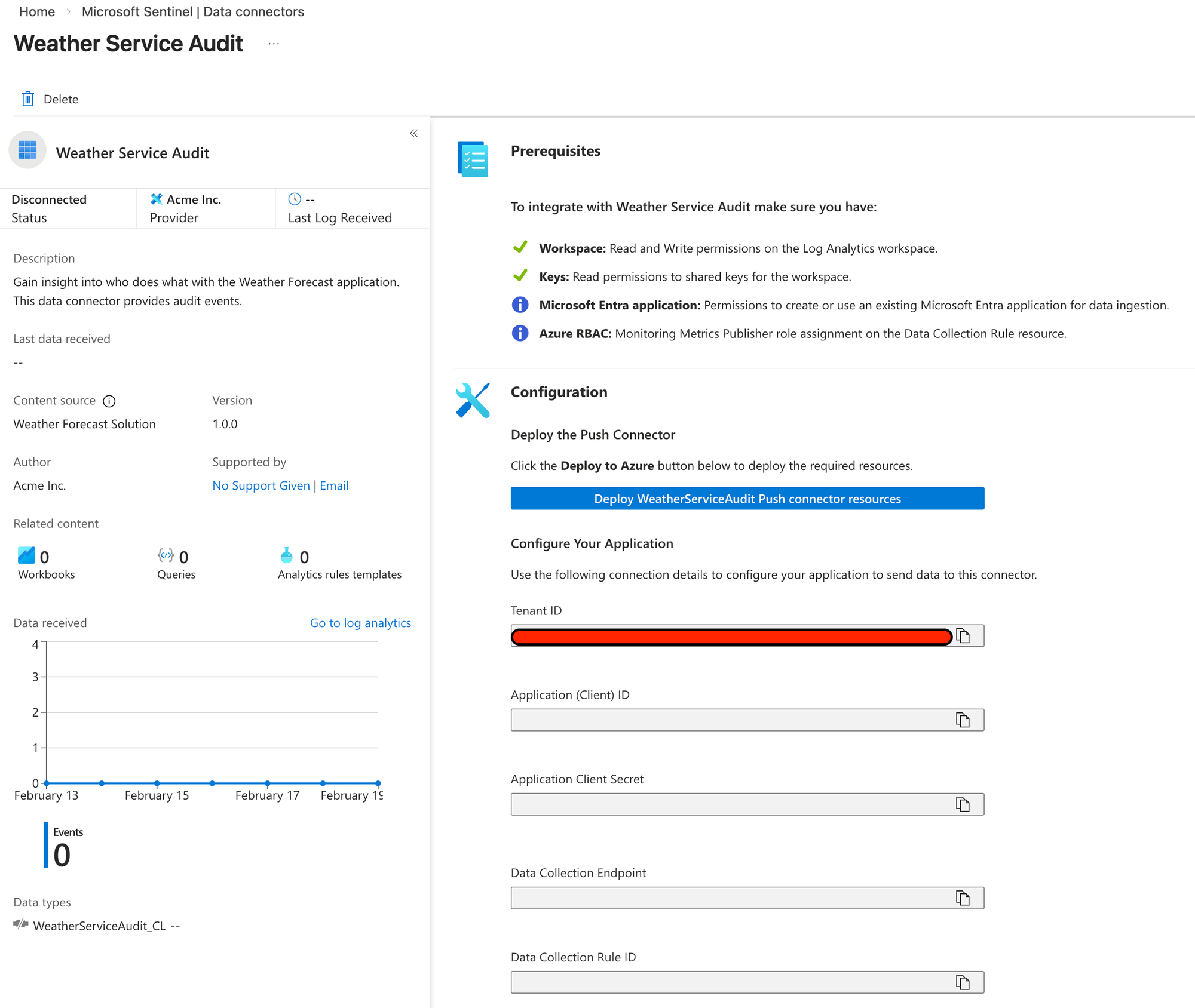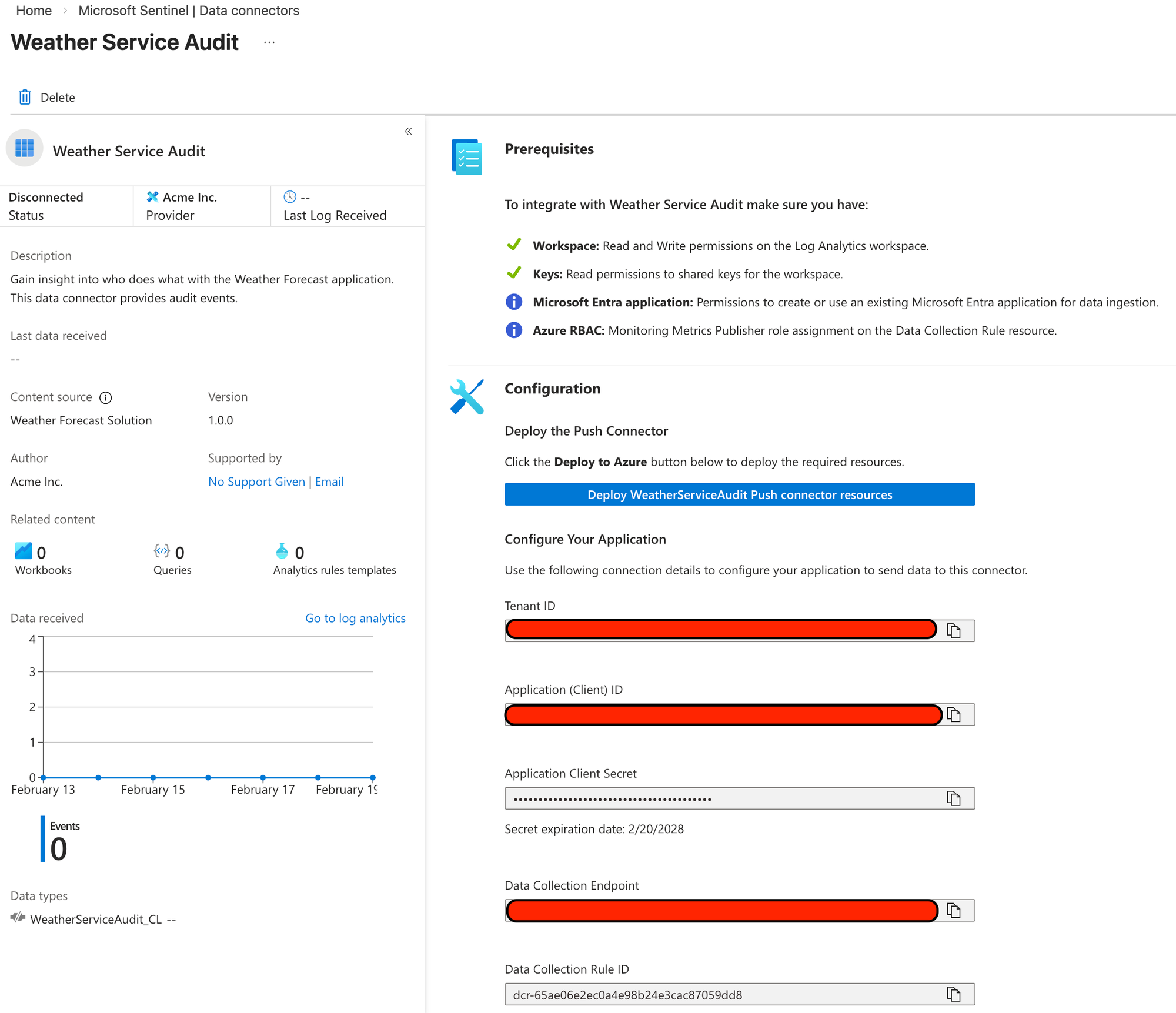 Clicking the Deploy button will enable the data connector and fill in the blank fields below which is what we will need to configure our application.