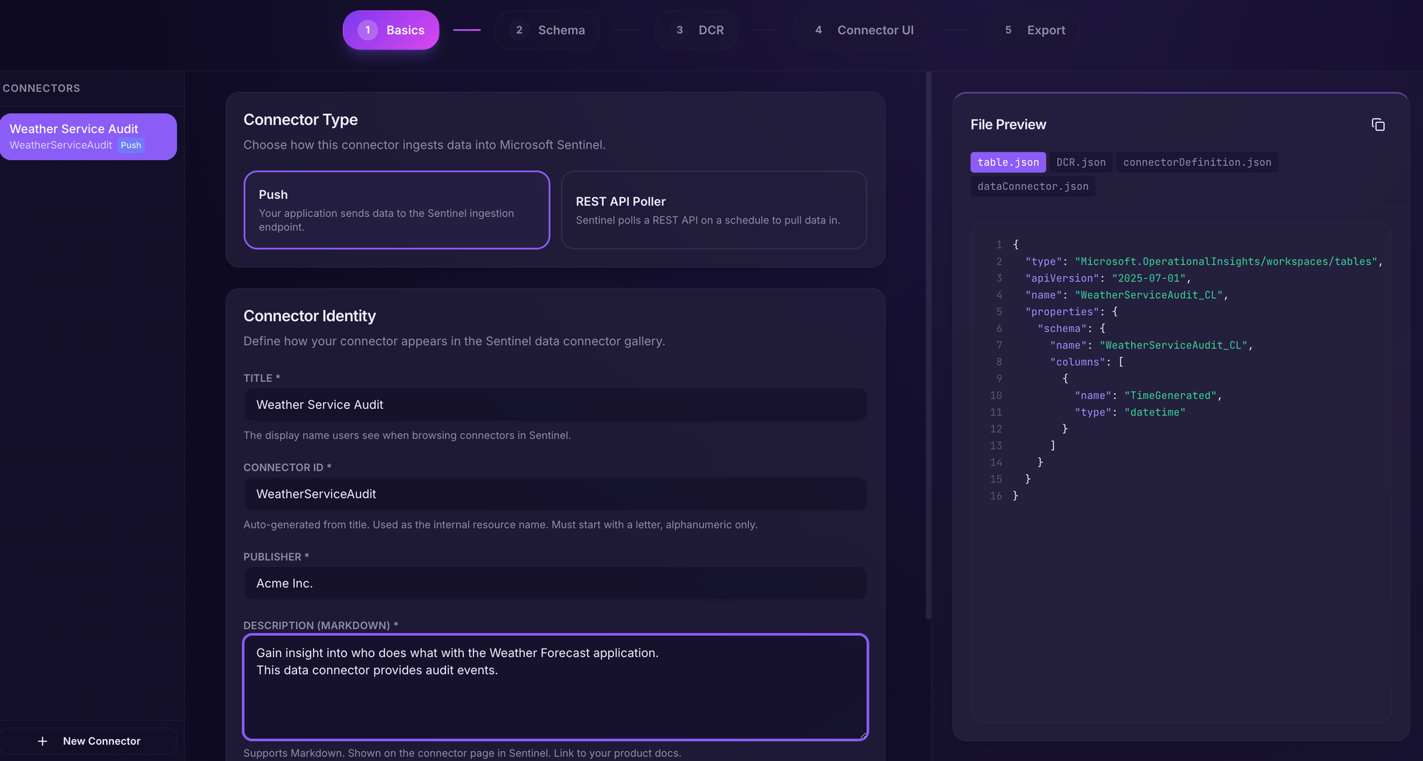 The first section is mainly which kind of connector we want to create (we'll use Push for this example) and some metadata.
