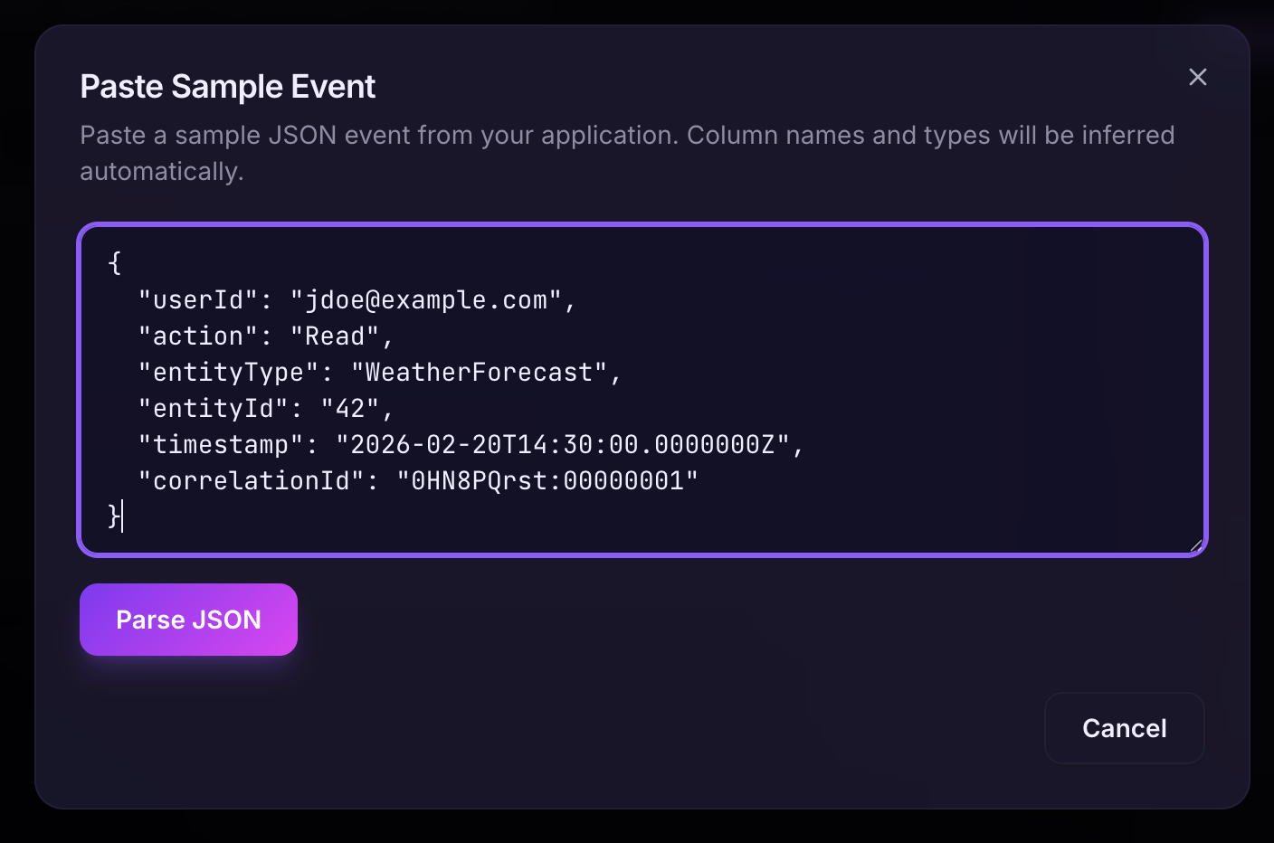 Going to the next section, we have our handy sample JSON that describes how the audit entry looks so we can just click "Paste sample event" or we can add the fields manually.