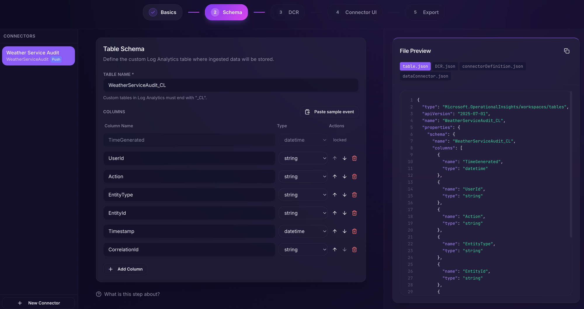 We'll now have our schema neatly defined. We can also customize the table name in this section - this is the name of the table that can be queried later in Sentinel.